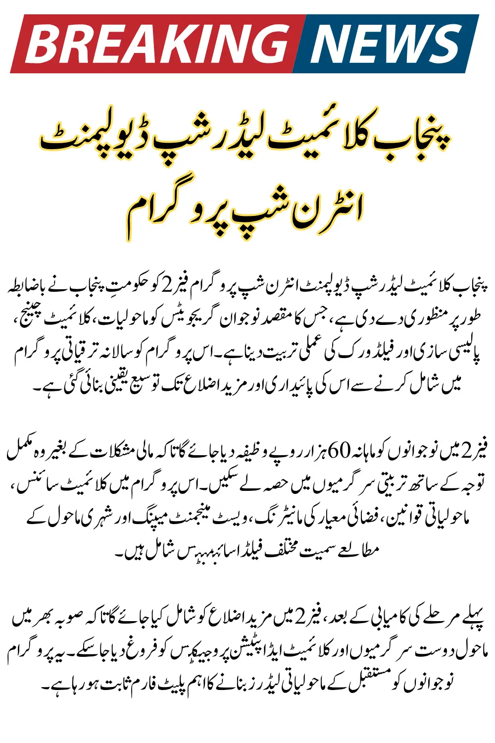 With climate risks rising across Pakistan, this internship is designed to prepare young graduates with essential knowledge in climate change, environmental policy, climate resilience, fieldwork, and practical leadership. The program’s expansion reflects Punjab’s commitment to long-term climate readiness and environmental governance.
